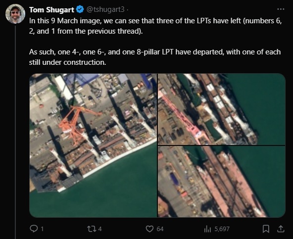 交际媒体大将视频拼接而成的图片与此同时,智库“新美国保险核心”的兼职高等研讨员汤姆·舒加特在其团体交际媒体账号上发推称,在近来的卫星遥感图像中发明,有三艘自升式驳船仿佛已从广船国际龙穴造船坞分开。他以为这些驳船是一种“平易近用帮助登岸运送平台”,并将其称为T-LPT,不外斟酌到近期影像中船体的白灰色难以识别,因而也不消除是军用船舶涂装的可能。据他剖析称,有三艘驳船在3月9日之后的某个时间分开了船坞,尚有三艘仍在船坞制作中。因为并不察看到这些驳船在这一时光前后的AIS数据,因而他揣测称这些船只现实大将用于军事用处,他还以此前在军地结合投送练习中的滚装渡轮也不开启AIS来作为某种佐证。